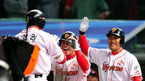 [OSEN=인천,김영민 기자]15일 인천 문학 경기장에서 열린 '2010 CJ 마구마구 프로야구 한국시리즈 1차전' SK 와이번스와 삼성 라이온즈 경기 6회말 1사 2루 박정권 투런 홈런을 날리고 홈인 이호준의 환영을 받으며 환호하고 있다./ ajyoung@osen.co.
