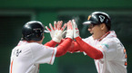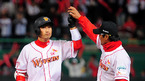 [OSEN=인천,김영민 기자]15일 인천 문학 경기장에서 열린 '2010 CJ 마구마구 프로야구 한국시리즈 1차전' SK 와이번스와 삼성 라이온즈 경기 6회말 1사 2루 박정권 투런 홈런을 날리고 홈인 선행주자 박재상과 환호하고 있다./ ajyoung@osen