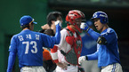 [OSEN=인천,김영민 기자]15일 인천 문학 경기장에서 열린 '2010 CJ 마구마구 프로야구 한국시리즈 1차전' SK 와이번스와 삼성 라이온즈 경기 6회초 2사 강봉규 솔로 홈런을 날리고 홈인 김재걸 코치의 환영을 받고 있다./ ajyoung@osen.co.kr화