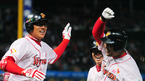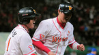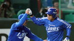 [OSEN=인천,김영민 기자]15일 인천 문학 경기장에서 열린 '2010 CJ 마구마구 프로야구 한국시리즈 1차전' SK 와이번스와 삼성 라이온즈 경기 5회말 2사 만루 김재현 2타점 적시타를 날리고 1루에서 김태균 코치의 환영을 받고 있다./ ajyoung@osen.co.kr
