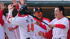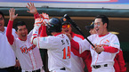 [OSEN=문학, 민경훈 기자] 2010 프로야구 한국시리즈 SK 와이번스와 삼성 라이온스의 2차전 경기가 16일 오후 인천 문학구장에서 열렸다.4회말 무사 주자 1루 SK 최정이 역전 투런 홈런을 날린 후 덕아웃에서 동료들과 기쁨을 나누고 있다. /rumi@osen.co.kr