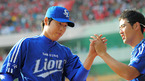 [OSEN=문학, 민경훈 기자] 2010 프로야구 한국시리즈 SK 와이번스와 삼성 라이온스의 2차전 경기가 16일 오후 인천 문학구장에서 열렸다.3이닝을 마치고 덕아웃으로 들어오는 삼성 선발 차우찬이 장원삼과 하이파이브를 하고 있다. /rumi@osen.co.kr