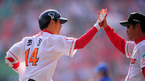 [OSEN=문학, 민경훈 기자] 2010 프로야구 한국시리즈 SK 와이번스와 삼성 라이온스의 2차전 경기가 16일 오후 인천 문학구장에서 열렸다.4회말 무사 주자 1루 SK 최정이 역전 투런 홈런을 날린 후 3루에서 이광길코치와 하이파이브를 하고 있다. /rumi@osen.co.kr