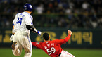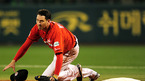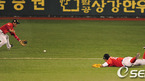 [OSEN=대구, 지형준 기자] 19일 오후 대구구장에서 열린 2010 프로야구 한국시리즈 4차전 SK 와이번스와 삼성 라이온즈의 경기, 2회말 무사에서 삼성 최형우의 우전안타에 1루 베이스 커버에 들어간 SK 글로버가 볼을 잡으려다 넘어지고 있다. /jpnews@osen.co.kr