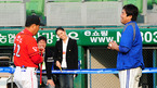 [OSEN=대구, 지형준 기자] 19일 오후 대구구장에서 열리는 2010 프로야구 한국시리즈 4차전 SK 와이번스와 삼성 라이온즈의 경기에 앞서 SK 이만수 코치와 삼성 양준혁이 MBC 스포츠 플러스 김민아 아나운서와 이야기를 나누며 즐거워하고 있다.&n