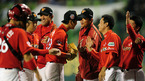 [OSEN=대구, 지형준 기자] 19일 오후 대구구장에서 열린 2010 프로야구 한국시리즈 4차전 SK 와이번스와 삼성 라이온즈의 경기, 8회말 2사 만루의 위기를 넘긴 SK 김광현이 덕아웃에서 동료선수들의 축하를 받고 있다. /jpnews@osen.co.kr