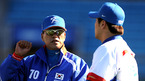 [OSEN=부산,박준형 기자]조범현 감독이 이끄는 광저우 아시안게임 야구대표팀이 27일 오후 부산 사직구장에서 훈련에 나섰다. 조범현 감독이 강민호와 이야기를 나누고 있다. /soul1014@osen.co.kr