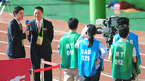 [OSEN=광저우,지형준 기자] 13일 오후 아시안게임 축구 팔레스타인과의 조별리그 3차전을 앞두고 허정무 인천 감독이 김정근 MBC 아나운서와 그라운드 잔디를 만져보며 이야기를 나누고 있다. /jpnews@osen.co.kr 화보로 보는 뉴스, 스마