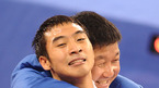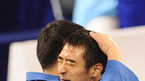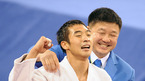 [광저우=김영민 기자] 15일 중국 광저우 화궁 체육관에서 열린 2010년 제16회 광저우 아시아경기 유도 남자 -66kg 결승전 경기에서 한국의 김주진이 우스베키스탄 미르조히드 파르모노프 와의 경기에서 금메달을 따내며 정훈 감독과 기쁨을 나누고 있다./ ajyoun