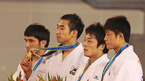 [광저우=김영민 기자] 15일 중국 광저우 화궁 체육관에서 열린 2010년 제16회 광저우 아시아경기 유도 남자 -66kg 결승전 경기에서 한국의 김주진이 우스베키스탄 미르조히드 파르모노프 와의 경기에서 금메달을 따내며 시상대에서 포즈를 취하고 있다./ ajyoun