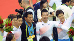 [광저우=김영민 기자] 16일 중국 광저우 벨르드롬 체육관에서 열린 2010년 제16회 광저우 아시아경기 단체추발 결승전 경기에서 한국의 조호성(서울시청), 장선재(대한지적공사), 황인혁(금산군청), 박선호(서울시청)가 금메달을 따냈다. 시상식을