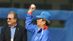 [OSEN=광저우,김영민 기자] 18일 중국 광저우 아오티 야구장에서 열린 제16회 광저우 아시아경기 한국-중국 야구 준결승 경기에서 한국야구위원회 유영구 시구를 마친뒤 박경완 선수로 부터 공을 건네받고 있다./ajyoung@osen.co.kr
