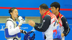 [OSEN=광저우,지형준 기자] 18일 오후 중국 광저우 광둥체육관에서 열린 아시안게임 태권도 여자 57kg급 16강 경기에서 앞서 이성혜가 코칭스태프와 이야기를 나누고 있다. /jpnews@osen.co.kr