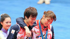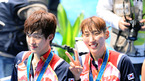 [OSEN=광저우,김영민 기자] 21일 중국 광저우 텐허 체육관에서 열린 제16회 광저우 아시아경기 배드민턴 혼합복식 결승 경기에서 신백철(21,한국체대)-이효정(29, 삼성전기)조가 중국을 꺽고 금메달을 따냈다. 이효정-신백철이 시상대에 오르며 환호하고&