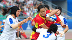 [OSEN=광저우 지형준 기자] 아시안게임에 첫 출전하는 여자 럭비 대표팀이 21일 오후 중국 광저우 유니버시티 타운 메인 스타디움에서 열린 중국과 예선 경기서 51대0으로 패배했다. 전반 한국 정하니가 중국 선수를 태클하고 있다.&nbs
