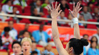 [OSEN=광저우 지형준 기자] 25일 오후 중국 광저우 인터내셔널 스포츠 아레나에서 벌어진 아시안게임 여자 농구 결승 한국과 중국과의 경기 3쿼터서 맹활약을 한 하은주를 후배들이 반갑게 맞이하고 있다. /jpnews@osen.co.kr