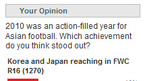 [OSEN=황민국 기자] 올해 아시아 축구계 최고 이슈는 무엇일까. 아시아축구연맹(AFC)의 설문조사에 따르면 한국과 일본의 동반 월드컵 16강 진출이 가장 큰 인상을 남긴 것으로 보인다. 15일(이하 한국시간) 현재 AFC 공식 홈페이지에서 진행되고 있