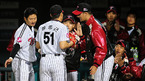 [OSEN=잠실,이대선 기자] 12일 '2011 롯데카드 프로야구' LG 트윈스와 한화 이글스의 경기가 서울 잠실야구장에서 열렸다. 7회초 1사 1루 한화 정원석 타석때 LG 봉중근이 마운드를 내려와 덕아웃에서 동료들의 환영을 받고 있다. /sunday@osen.co.kr
