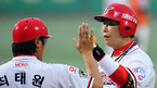 [OSEN=광주,지형준기자] 1일 오후 광주구장에서 열린 '2011 롯데카드 프로야구' KIA 타이거즈와 한화 이글스의 경기, 1회말 1사 1,2루에서 KIA 나지완이 1타점 적시타를 날리고 최태원 코치와 하이파이브를 하고 있다. /jpnews@osen.co.kr