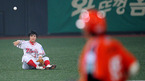 [OSEN=광주,지형준기자] 1일 오후 광주구장에서 열린 '2011 롯데카드 프로야구' KIA 타이거즈와 한화 이글스의 경기, 4회초 1사에서 KIA 김선빈이 한화 가르시아의 안타성 타구를 몸을 날려 잡아내자 가르시아가 김선빈을 바라보며 더그아웃으로 향