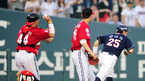 [OSEN=잠실,이대선 기자] 1일 '2011 롯데카드 프로야구' LG 트윈스와 두산 베어스의 경기가 잠실야구장에서 열렸다. 3회초 1사 2,3루 두산 고영민의 우전 1타점 적시타때 3루를 밟은 2루주자 양의지가 홈으로 쇄도하려다 런다운에 걸려 LG 조인성의 태그를