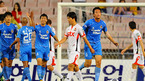 [OSEN=울산,박준형 기자] 6일 오후 울산 문수월드컵경기장서 열린 '2011 러시앤캐시컵' 준결승전 울산 현대와 경남 FC의 경기 후반 울산 김신욱이 역전골을 넣고 환호하고 있다. 반면 경남 선수들은 아쉬운 표정을 짓고 있다/ soul1014@osen.co.kr