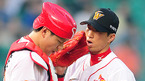 [OSEN=문학, 민경훈 기자] 6일 오후 문학 구장에서 '2011 롯데카드 프로야구' SK 와이번스와 삼성 라이온즈의 경기가 열렸다. 4회초 1사 주자 1,2루 삼성 조동찬 타석에서 SK 선발 고효준과 정상호 포수가 얘기를 나누고 있다./ rumi@osen.co.kr