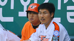 [OSEN=대전,박준형 기자] 7일 오후 대전 한밭구장에서 열린 '2011 롯데카드 프로야구' 한화 이글스와 LG 트윈스의 경기 1회말 어깨 통증으로 1군 엔트리에 빠진 한화 류현진이 더그아웃에 앉아 장성호를 바라보고 있다. / soul1014@osen.co.kr