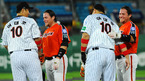 [OSEN=사직,지형준 기자] 14일 오후 부산 사직구장에서 열린 '2011 롯데카드 프로야구' 롯데 자이언츠와 한화 이글스의 경기, 8회초 1사 2,3루에서 한화 박노민의 2타점 적시타에 홈을 밟은 이양기와 전현태가 이여상과 하이파이브를 하고 있다. /jpnews@osen.co.kr