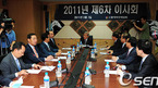 [OSEN=이대선 기자] 한국야구위원회(KBO)가 2일 서울 도곡동 야구회관에서 2011년 제6차 이사회를 열고 임원 선출 방안을 논의했다. 이용일 총재대행과 각 구단 사장단이 논의를 하고 있다. / sunday@osen.co.kr