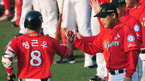 [OSEN=대구,지형준기자] 3일 오후 대구구장에서 열린 '2011 롯데카드 프로야구' 삼성 라이온즈와 SK 와이번스의 경기, 1회초 무사에서 SK 정근우가 선제 솔로포를 날리고 더그아웃에서 이만수 감독대행과 하이파이브를 하고 있다./j