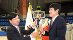 [OSEN=잠실학생체 ,백승철 인턴기자] 6일 오후 서울 잠실 학생체육관서 열린 2011-2012 프로농구 서울 SK와 안양 인삼공사의 시범 경기, 경기 종료후 SK 출정식에서 서정원 단장이 문경은 감독대행에게 단기를 건내주고 있다. 인삼공