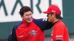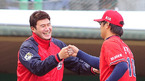 [OSEN=인천, 김영민 기자] '2011 롯데카드 프로야구' SK 와이번스와 KIA 타이거즈의 준플레이오프 2차전이 9일 문학야구장에서 열렸다. 9회말을 마무리 한 한기주를 서재응이 맞이하고 있다. 3선승제의 준플레이오프 1차전을 내줘 쫓