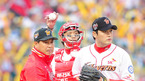 [OSEN=인천, 김영민 기자] '2011 롯데카드 프로야구' SK 와이번스와 KIA 타이거즈의 준플레이오프 2차전이 9일 문학야구장에서 열렸다. 9회말 2사 만루에서 KIA 한기주가 이호준을 내야땅볼로 처리하며 공수교대때 서재응의 축하를 받