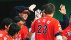 [OSEN=인천, 김영민 기자] '2011 롯데카드 프로야구' SK 와이번스와 KIA 타이거즈의 준플레이오프 2차전이 9일 문학야구장에서 열렸다. 7회말 선두타자 안치용 좌월 동점 솔로홈런을 날리고 홈인 동료들의 환영을 받고 있다. 3선승제