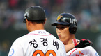 [OSEN=인천, 김영민 기자] '2011 롯데카드 프로야구' SK 와이번스와 KIA 타이거즈의 준플레이오프 2차전이 9일 문학야구장에서 열렸다. 연장11회말 무사 1루 정근우 내야안타를 날리고 1루 정경배 코치의 환영을 받고 있다. 3선승제의
