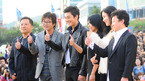 [OSEN=부산,박준형 기자]9일 오후 부산 해운대 피프빌리지에서 열린 영화 '완득이' 야외 무대인사에서 출연배우들이 박수를 치고 있다. 개성과 인간미 넘치는 교사 김윤석과 거칠지만 깊은 속내의 반항아 유아인의 연기 호흡이