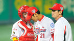 [OSEN=광주, 민경훈 기자] '2011 롯데카드 프로야구' KIA 타이거즈와 SK 와이번스의 준플레이오프 4차전이 12일 오후 광주 무등 야구장에서 열렸다. 3회초 1사 주자 2루 SK 안치용 타석에서 KIA 선발 윤석민이 강판당하며 서재응에게 위