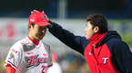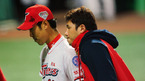 [OSEN=광주, 김영민 기자] '2011 롯데카드 프로야구' KIA 타이거즈와 SK 와이번스의 준플레이오프 4차전이 12일 오후 광주 무등 야구장에서 열렸다. KIA 선발 윤석민이 2⅓이닝 3실점을 허용하며 강판 당하면서 서재응의 위로를 받고