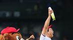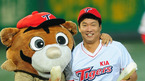 [OSEN=광주, 민경훈 기자] '2011 롯데카드 프로야구' KIA 타이거즈와 SK 와이번스의 준플레이오프 4차전이 12일 오후 광주 무등 야구장에서 열렸다. 경기 전 코미디언 박준형이 승리기원 시구를 한 후 무를 받고 있다. 준플레이오프 4