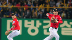 [OSEN=광주, 민경훈 기자] '2011 롯데카드 프로야구' KIA 타이거즈와 SK 와이번스의 준플레이오프 4차전이 12일 오후 광주 무등 야구장에서 열렸다. 2회초를 마무리한 KIA 선발 윤석민이 서재응과 하이파이브를 하고 있다. 준플레이오