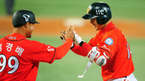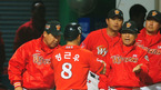 [OSEN=광주, 김영민 기자] '2011 롯데카드 프로야구' KIA 타이거즈와 SK 와이번스의 준플레이오프 4차전이 12일 오후 광주 무등 야구장에서 열렸다. 6회초 2사 박재상의 적시타때 2루 주자 정근우 득점을 올리자 이만수 감독 대행이
