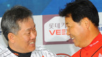 [OSEN=부산,박준형 기자] 15일 오후 부산 사직구장 내 특설무대에서 열린 '2011 롯데카드 프로야구 포스트시즌 플레이오프 미디어데이'에서 롯데 양승호 감독과 SK 이만수 감독이 악수를 나누고 있다. 이날 미디어데이에서 롯데는
