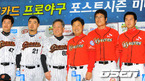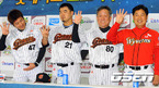 [OSEN=부산,박준형 기자] 15일 오후 부산 사직구장 내 특설무대에서 열린 '2011 롯데카드 프로야구 포스트시즌 플레이오프 미디어데이'에서 롯데 양승호 감독과 강민호, 송승준, SK 이만수 감독대행, 박정권, 최정이 포즈를 취하고