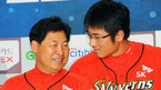 [OSEN=부산,박준형 기자] 15일 오후 부산 사직구장 내 특설무대에서 열린 '2011 롯데카드 프로야구 포스트시즌 플레이오프 미디어데이'에서 SK 이만수 감독대행이 박정권과 이야기를 나누고 있다. 이날 미디어데이에서 롯데는 양