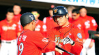[OSEN=부산,손용호 기자] 2011 롯데카드 프로야구 플레이오프 1차전 SK 박정권이 4회초 추격의 솔로홈런을 치고 정경배 코치의 환영을 받고 있다. 16일 부산사직구장에서 롯데 자이언츠와 SK 와이번스의 플레이오프 1차전 경기가 벌