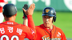 [OSEN=부산,박준형 기자]16일 오후 부산 사직구장서 열린 2011 롯데카드 프로야구 플레이오프 1차전 롯데 자이언츠와 SK 와이번스의 경기 4회초 2사 1,2루 상황에서 SK 정근우가 동점 1타점 적시타를 날린 후 정경배 코치에게 축하를