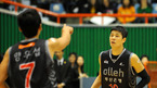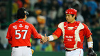 [OSEN=부산사직체,이대선 기자] '2011~2012 KB국민카드 프로농구' 부산 KT와 안양 KGC의 경기가 16일 부산사직체육관에서 열렸다. 4쿼터 부산 조성민이 3점슛을 성공시키고 양우섭의 축하를 받고 있다. / sunday@osen.co.kr