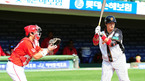 [OSEN=부산,손용호 기자] 2011 롯데카드 프로야구 플레이오프 1차전시구에 나선 영화 '투혼'의 주연배우 김선아와 김주혁이 멋진 폼으로 시구와 시타를 하고 있다. 16일 부산사직구장에서 롯데 자이언츠와 SK 와이번스의 플레이오
