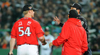[OSEN=부산,이대선 기자] 2011 롯데카드 프로야구 플레이오프 2차전 3회말 무사 SK 고든이 12초룰을 어기며 1차 경고를 받고 있다. 17일 부산 사직구장에서 벌어진 플레이오프 2차전서 롯데는 양승호 감독이 예고한대로 송승준을 SK